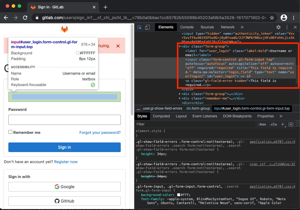 - Load the login page in a browser and verify the [selectors](#finding-an-elements-selector) configured in `DAST_AUTH_USERNAME_FIELD`, `DAST_AUTH_PASSWORD_FIELD`, `DAST_AUTH_FIRST_SUBMIT_FIELD`, and `DAST_AUTH_SUBMIT_FIELD` are correct.