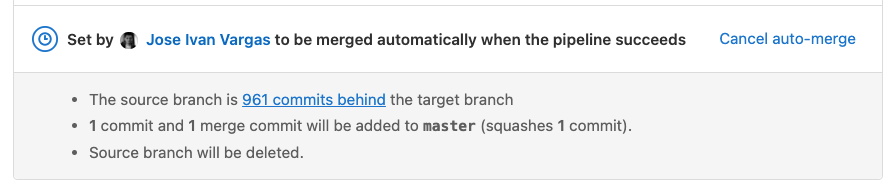 If the content of a merge request is ready to merge, you can select Set to auto-merge. The merge request auto-merges when all required checks complete successfully, and you don't need to remember to manually merge the merge request.